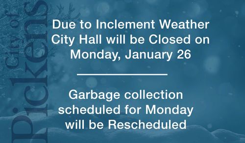 Due to inclement weather, Pickens City Hall will be closed on Monday, January 26, to ensure the safety of our staff and the public.