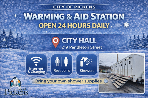 The City of Pickens Warming and Aid Station is operating 24 hours a day at City Hall.
